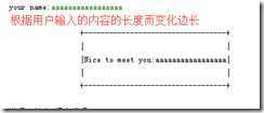 小练习21 inpot = raw_input("your name:") #欢迎信息 2 text = len(inpot) 3 scr = 17+text #设置一个长度 4 left = (scr) // 2 #设置前方空格的空隙 5 #下方输出的内容可以根据输入字符串的长度进行变化 6 print #输出空 7 print ‘ ‘ * left + ‘+‘+ ‘-‘*(scr) + ‘+‘ 8 print ‘ ‘ * left + ‘|‘+ ‘ ‘*scr + ‘|‘ 9 print ‘ ‘ * left + ‘|‘+‘Nice to meet you:‘ +inpot+ ‘|‘ 10 print ‘ ‘ * left + ‘|‘+ ‘ ‘*scr + ‘|‘ 11 print ‘ ‘ * left + ‘+‘+ ‘-‘*(scr) + ‘+‘