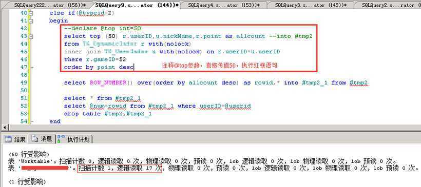 最近在优化数据库服务器上高消耗语句/过程,发现一个存储过程优化后依旧出现在Profiler跟踪里。将Profiler跟踪文件中过程执行语句取出,打开一个查询窗口(SPID=144),set statistics io on,同时开启Profiler跟踪SPID=144中的语句执行情况。