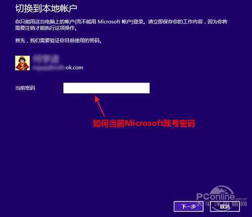 5.当然断开前,系统需要输入绑定的Microsoft账户密码,输入后点击“下一步”;