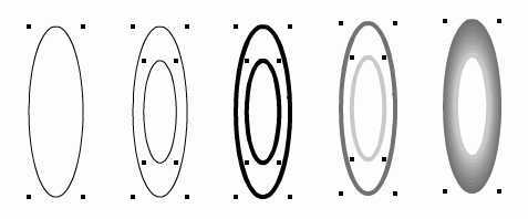 制作中间按钮,用椭圆工具画个椭圆,用clone命令clone,用transform工具调整其大小为原来的60%,改变线形宽度为4,改变线形颜色,用modifly命令中的blend命令,使其混合,如图