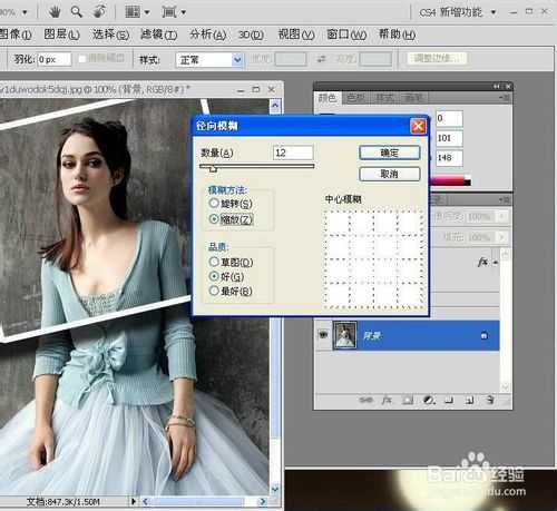 6、回到背景层,选择“滤镜”—“模糊”—“径向模糊”,在打开的窗口中,设置径向模糊中的数量为12,模糊方法为“缩放”;