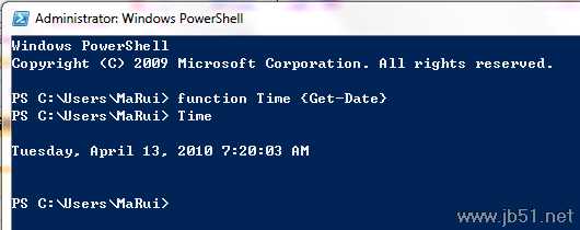 这样,我们就有了一个新函数"Time",其功能实现代码就是"{Get-Date}"。