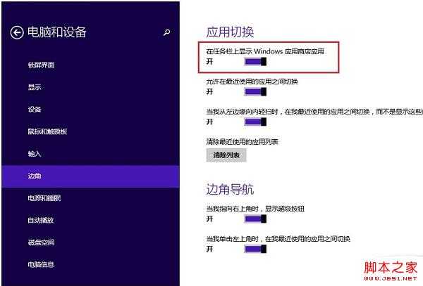 打开超级按钮——"设置"——"更改电脑设置"——"电脑和设备"——"边角",开启"在任务栏上显示 Windows 应用商店应用"这个选项即可;