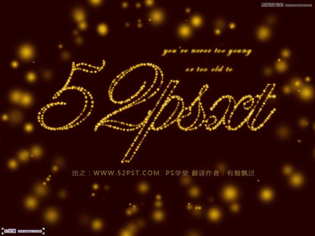 本文主要教大家使用Photoshop制作出梦幻黄色光点艺术字效果教程,教程难度一般,适合初学者学习,喜欢的朋友可以一起来学习具体效果: