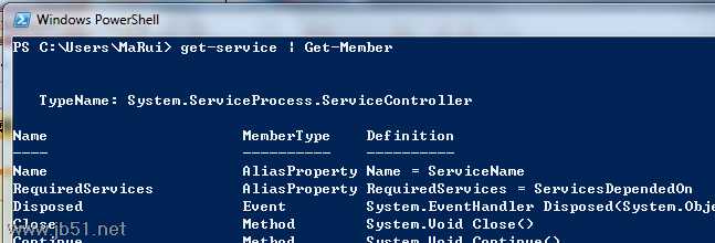 当然,我们可以使用"get-member"的参数来查看"get-service"的所有的属性类对象,或者方法类对象。