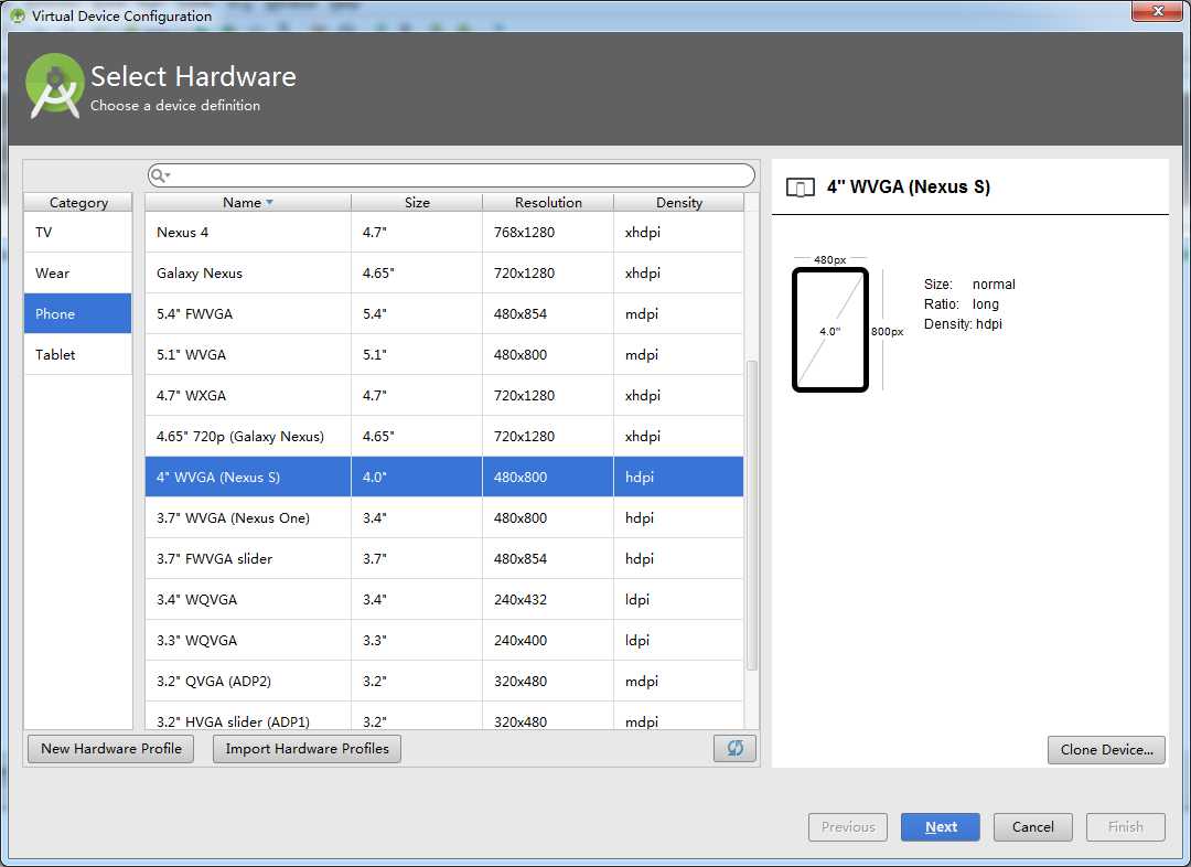 点击Create Virtual Device 按钮,选择一款手机 点击下一步