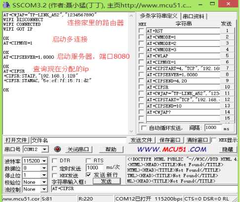 3,连接家里的路由AT+CWJAP="TP-LINK_A52","1234567890"