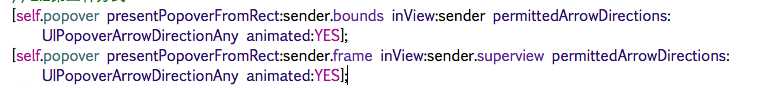 1 - (IBAction)buttonClick:(UIButton *)sender { 2 3 //1.新建一个popoverController并设置其内容控制器 4 YYMenuViewController *menuVc=[[YYMenuViewController alloc]init]; 5 self.popover=[[UIPopoverController alloc]initWithContentViewController:menuVc]; 6 7 //设置过滤掉一些控件 8 self.popover.passthroughViews=@[self.switchview]; 9 10 //2.显示 11 //2.1第一种方式 12 // [self.popover presentPopoverFromBarButtonItem:<#(UIBarButtonItem *)#> permittedArrowDirections:<#(UIPopoverArrowDirection)#> animated:<#(BOOL)#>]; 13 //2.2第二种方式 14 // [self.popover presentPopoverFromRect:sender.bounds inView:sender permittedArrowDirections:UIPopoverArrowDirectionAny animated:YES]; 15 [self.popover presentPopoverFromRect:sender.frame inView:sender.superview permittedArrowDirections:UIPopoverArrowDirectionAny animated:YES]; 16 //说明:popover会指向sender.bounds这一块矩形框,这块矩形框以sender的左上角为坐标原点 17 //注意:注意sender.frame和sender.bounds的区别 18 19 }