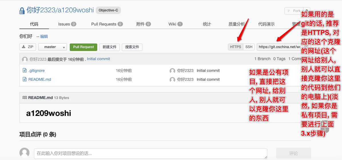 7. 别人如何拉取这个项目, 把HTTPS克隆网址给他(如果是私有项目, 请确定把对方oschina账号添加到你的项目中了)