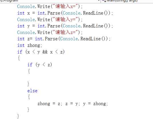 以上是x最小的情况,y于z进行比较然后赋值,不同的是不用输出,因为所有的执行完毕都是x,y,z的顺序,最后输出一次就够因此if的{}是空格