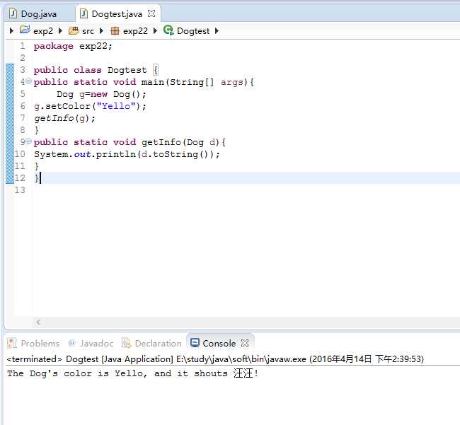 return "The Dog‘s color is " + this.getColor() +", and it shouts "+ this.shout() + "!";