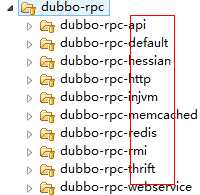 Dubbo提供了很多协议,Dubbo协议、RMI协议、Hessian协议,我们查看Dubbo源代码,有各种协议的实现,如图所示: