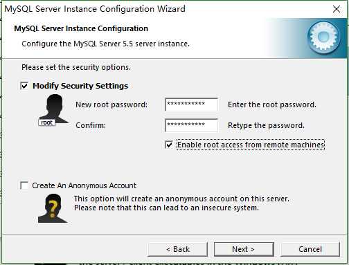 19.在这里设置MySQL的密码,并选中Enable root access from remote machines。点击Next。