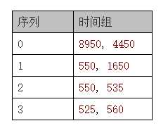 以上面我们截获的数据为例,简化一下,可以用四组时间组表示,分别为 (8950, 4450), (550, 1650), (550, 535), (525, 560)