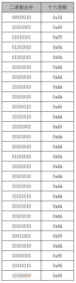 。。。 const uint16_t code_na000Times[] PROGMEM = { 8950, 4450, 550, 1650, 550, 535, 525, 560, }; const struct IrCode code_na000Code PROGMEM = { freq_to_timerval(38400), 106, // 106组时间序列 2, // 不同的组一共四组,因此使用2bit就可以表示,这个解码需要用到 code_na000Times, { 0x16, 0xA9, 0x55, 0x6A, 0x6A, 0xAA, 0xAA, 0xAA, 0xAA, 0xA6, 0xAA, 0xA9, 0xAA, 0xAA, 0x6A, 0xAA, 0xAA, 0xAA, 0xAA, 0xAA, 0xAA, 0xAA, 0x99, 0xAA, 0x95, 0x96, 0x90, } }; 。。。