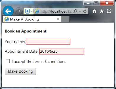 @model ModelValidation.Models.Appointment @{ ViewBag.Title = "Make A Booking"; } <h4>Book an Appointment</h4> @using (Html.BeginForm()) { @Html.ValidationSummary() <p>Your name: @Html.EditorFor(m => m.ClinetName)</p> <p>Appointment Date: @Html.EditorFor(m => m.Date)</p> <p>@Html.EditorFor(m => m.TermsAccepted) I accept the terms $ conditions</p> <input type="submit" value="Make Booking" /> }