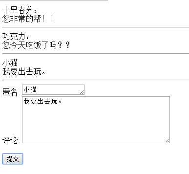 1 <!DOCTYPE html PUBLIC "-//W3C//DTD XHTML 1.0 Transitional//EN" "http://www.w3.org/TR/xhtml1/DTD/xhtml1-transitional.dtd"> 2 <html xmlns="http://www.w3.org/1999/xhtml"> 3 <head> 4 <meta http-equiv="Content-Type" content="text/html; charset=utf-8" /> 5 <title>无标题文档</title> 6 <script src="jquery-1.11.2.min.js"></script> 7 8 </head> 9 <body> 10 <div id="ly"> 11 <div>十里春分:</div> 12 <div>您非常的帮!!</div> 13 <hr /> 14 <div>巧克力:</div> 15 <div>您今天吃饭了吗??</div> 16 <hr /> 17 </div> 18 19 <div> 20 21 匿名 22 <textarea class="nm" cols="15" rows="1"></textarea> 23 <br /> 24 评论 25 <textarea class="pl" cols="40" rows="6"></textarea><br /><br /> 26 <input class="btn" type="button" value="提交" /> 27 28 </div> 29 30 </body> 31 </html> 32 33 <script type="text/javascript"> 34 $(document).ready(function(e) { 35 $(".btn").click(function(){ 36 if($(".nm").val() != ""){ 37 var cc = "<div>"+$(".nm").val()+"</div>"+"<div>"+ 38 $(".pl").val()+"</div><hr/>"; 39 $("#ly").append(cc); 40 }else{ 41 alert("匿名、留言不能为空"); 42 } 43 }); 44 }); 45 </script>