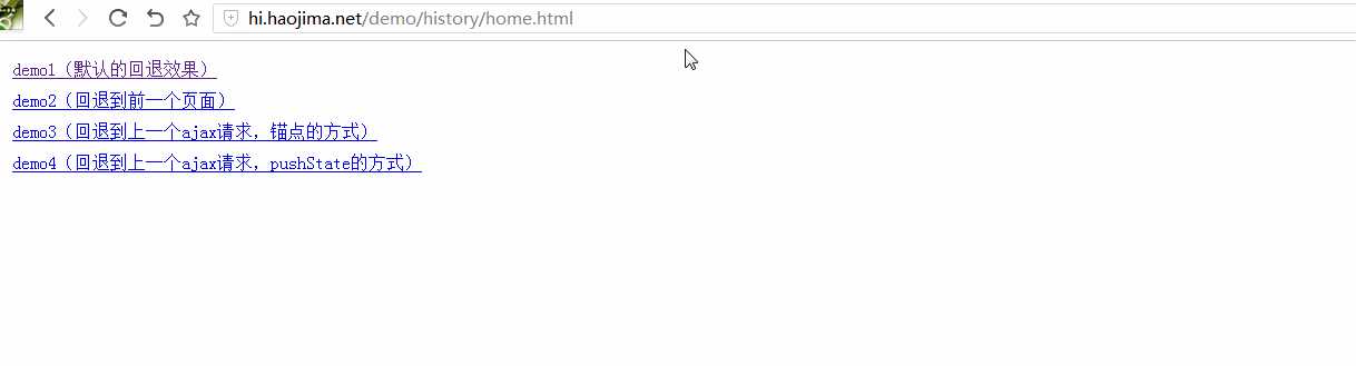 <!DOCTYPE html> <html xmlns="http://www.w3.org/1999/xhtml"> <head> <meta http-equiv="Content-Type" content="text/html; charset=utf-8" /> <title></title> <style type="text/css"> ul { list-style: none; } ul li { float: left; margin-left: 10px; } </style> </head> <body> <div style="color: red; margin-left: 50px; ">demo1(默认的回退效果)</div> <div> <ul> <li><a href="#tab1">tab1</a></li> <li><a href="#tab2">tab2</a></li> <li><a href="#tab3">tab3</a></li> <li><a href="#tab4">tab4</a></li> <li><a href="#tab5">tab5</a></li> </ul> </div> <input style="margin-left:15px" type="button" value="回退" onclick="history.go(-1)" /> <a href="home.html">主页</a> <div class="content" style="font-size:44px;color:red;margin-top:50px;text-align:center"> </div> <script src="../../Scripts/jquery-1.8.2.js"></script> <script type="text/javascript"> $(function () { //刷新url时停留ajax的效果 var hash = window.location.hash; $("ul").find("a[href=‘" + hash + "‘]").click(); }) $("ul").click(function (e) { if (e.target.localName != "a") return; var value = $(e.target).attr("href"); $.get("temp.html", value, function (obj) {//ajax的get请求 //请求发送成功后修改页面元素内容 $(".content").html("我是" + value); }, "text"); }); </script> </body> </html>