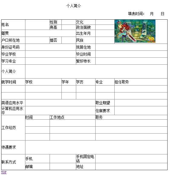 1 <!doctype html> 2 <html lang="en"> 3 <head> 4 <meta charset="UTF-8"> 5 <title>大简历</title> 6 <meta name="Keywords" content="关键字"> 7 <meta name="Description" content="描述"> 8 </head> 9 <body> 10 <div> 11 <p> 12 <a name="个人简介">个人简介</a> 13 </p> 14 <p> 15 填表时间: 月 日 16 </p> 17 <table style="border-collapse:collapse;" cellpadding="0"; cellspacing="0"; border="1";> 18 <tr><!-- 第一行 姓名,性别,文化,图片 --> 19 <td rowspan="2" width="100">姓名</td> 20 <td rowspan="2" width="103"></td> 21 <td width="50">性别</td> 22 <td width="60"></td> 23 <td width="80">文化</td> 24 <td width="80"></td> 25 <td width="220" rowspan="4"> 26 <img src="img/人物1.jpg" width="180";height="600"; alt="人物图片"> 27 </td> 28 </tr> 29 <tr><!-- 第二行 身高,政治面貌--> 30 <td>身高</td> 31 <td></td> 32 <td>政治面貌</td> 33 <td></td> 34 </tr> 35 <tr><!-- 第三行 籍贯,出生年月 --> 36 <td height="30">籍贯</td> 37 <td colspan="3"></td> 38 <td>出生年月</td> 39 <td></td> 40 </tr> 41 <tr><!-- 第四行 户口所在地,婚否,民族 --> 42 <td height="30">户口所在地</td> 43 <td></td> 44 <td >婚否</td> 45 <td ></td> 46 <td>民族</td> 47 <td></td> 48 </tr> 49 <tr><!-- 第五行 身份证,居住地--> 50 <td height="30">身份证号码</td> 51 <td colspan="3"></td> 52 <td>现居住地</td> 53 <td colspan="2"></td> 54 </tr> 55 <tr><!-- 第六行 毕业学校,毕业时间--> 56 <td height="30">毕业学校</td> 57 <td colspan="3"></td> 58 <td>毕业时间</td> 59 <td colspan="2"></td> 60 </tr> 61 <tr><!-- 第七行 学习专业,爱好特长--> 62 <td height="30">学习专业</td> 63 <td colspan="3"></td> 64 <td>爱好特长</td> 65 <td colspan="2"></td> 66 </tr> 67 <tr><!-- 第八行 个人简介--> 68 <td height="60">个人简介</td> 69 <td colspan="6"></td> 70 </tr> 71 <tr><!-- 第九行 就学时间,学年,学历,专业,担任职务--> 72 <td height="30">就学时间</td> 73 <td colspan="2">学校</td> 74 <td>学年</td> 75 <td>学历</td> 76 <td>专业</td> 77 <td>担任职务</td> 78 </tr> 79 <tr><!-- 第十行 --> 80 <td height="30"></td> 81 <td colspan="2"></td> 82 <td></td> 83 <td></td> 84 <td></td> 85 <td></td> 86 </tr> 87 <tr><!-- 第十一行 --> 88 <td height="30"></td> 89 <td colspan="2"></td> 90 <td></td> 91 <td></td> 92 <td></td> 93 <td></td> 94 </tr> 95 <tr><!-- 第十二行 英语水平,职业期望--> 96 <td height="30">英语应用水平</td> 97 <td colspan="4"></td> 98 <td>职业期望</td> 99 <td></td> 100 </tr> 101 <tr><!-- 第十三行 计算机应用水平,住宿要求--> 102 <td height="30">计算机应用水平</td> 103 <td colspan="4"></td> 104 <td>住宿要求</td> 105 <td></td> 106 </tr> 107 <tr><!-- 第十四行 工作经历,工作地点,职务--> 108 <td height="30"; rowspan="4">工作经历</td> 109 <td>时间</td> 110 <td colspan="3">工作地点</td> 111 <td colspan="2">职务</td> 112 </tr> 113 <tr><!-- 第十五行 --> 114 <td height="30"></td> 115 <td colspan="3"></td> 116 <td colspan="2"></td> 117 </tr> 118 <tr><!-- 第十六行 --> 119 <td height="30"></td> 120 <td colspan="3"></td> 121 <td colspan="2"></td> 122 </tr> 123 <tr><!-- 第十七行 --> 124 <td height="30"></td> 125 <td colspan="3"></td> 126 <td colspan="2"></td> 127 </tr> 128 <tr><!-- 第十八行 待遇要求--> 129 <td height="60">待遇要求</td> 130 <td colspan="6"></td> 131 </tr> 132 <tr><!-- 第十九行 联系方式--> 133 <td height="30" rowspan="2">联系方式</td> 134 <td>手机</td> 135 <td colspan="2"></td> 136 <td>手机固定电话</td> 137 <td colspan="2"></td> 138 </tr> 139 <tr><!-- 第二十行 邮编,地址--> 140 <td height="30">邮编</td> 141 <td colspan="2"></td> 142 <td>地址</td> 143 <td colspan="2"></td> 144 </tr> 145 </table> 146 <a href="#个人简介">TOP</a> 147 </div> 148 </body> 149 </html>