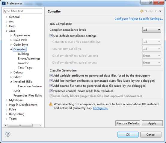 选择了以后,选中JDK Compliance,去掉Use default compliance swttings ..前面的那个选择框,就可以自己选择使用的jdk版本了。