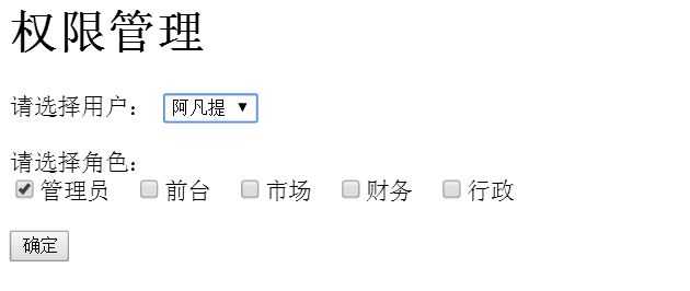 <?php include("../DBDA.class.php"); $db=new DBDA(); $uid=$_POST["uid"]; $js=$_POST["juese"]; $juese=explode("|",$js); $bs=true; //清空该用户具有的所有角色 $sqldel="delete from UserInJueSe where UserId = ‘{$uid}‘ "; $z=$db->Query($sqldel,1); if(!$z) { $bs=$bs && false; } //添加角色信息 foreach($juese as $v) { $sql="insert into userinjuese values(‘‘,‘{$uid}‘,‘{$v}‘)"; $r=$db->Query($sql ,1); if(!$r) { $bs=$bs && false; } } if($bs) { echo "OK"; } else { echo "NO"; }