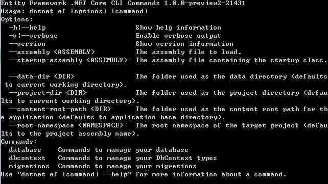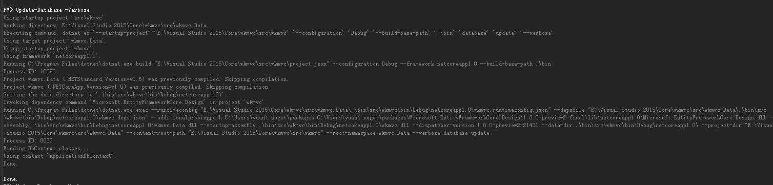添加完成,我们可以执行 dotnet ef database update 等其它操作了,详细参考 https://docs.efproject.net/en/latest/miscellaneous/cli/dotnet.html?highlight=migrations#usage