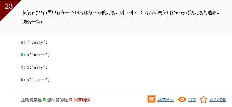 此题目考查的是jQuery中before()方法的应用。 A是在被选元素之后插入,C是在被选元素内尾部插入,D是在被选元素内前端插入,只有B是在被选元素之前插入。