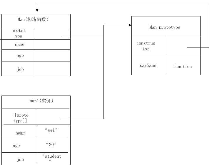 1 function Man(name, age, job) { 2 this.name = name; 3 this.age = age; 4 this.job = job; 5 } 6 var man1 = new Person(‘Weiwei‘, 27, ‘Student‘); 7 var man2 = new Person(‘Lily‘, 25, ‘Doctor‘);