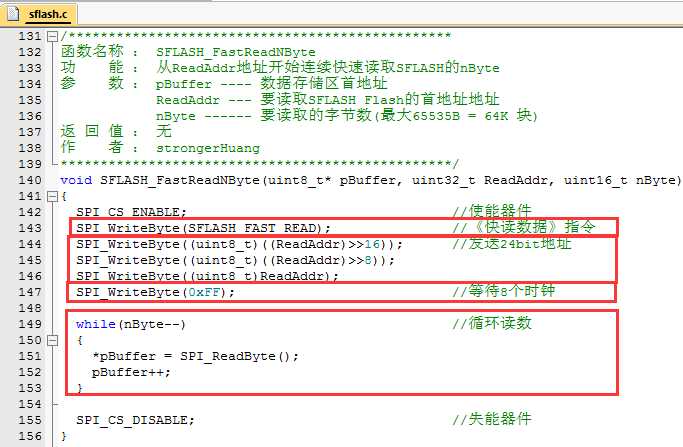 1.写入指令0x0B; 2.写入24位地址; 3.写入8个时钟; 4.连续读出N字节数据(只要有时钟,可以连续读出多字节);