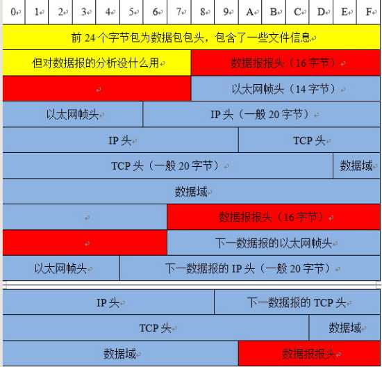 以TCP协议为例,详细解析PCAP文件格式。PCAP前24个字节为文件头,包含了文件信息,其结构如图 11所示。接着16个字节为TCP协议数据包包头,记录这个包头的一些信息。再接着为协议数据包内容,长度不定,本例为TCP,其结构为:以太网帧、IP头、TCP头、数据域。如图 12所示: