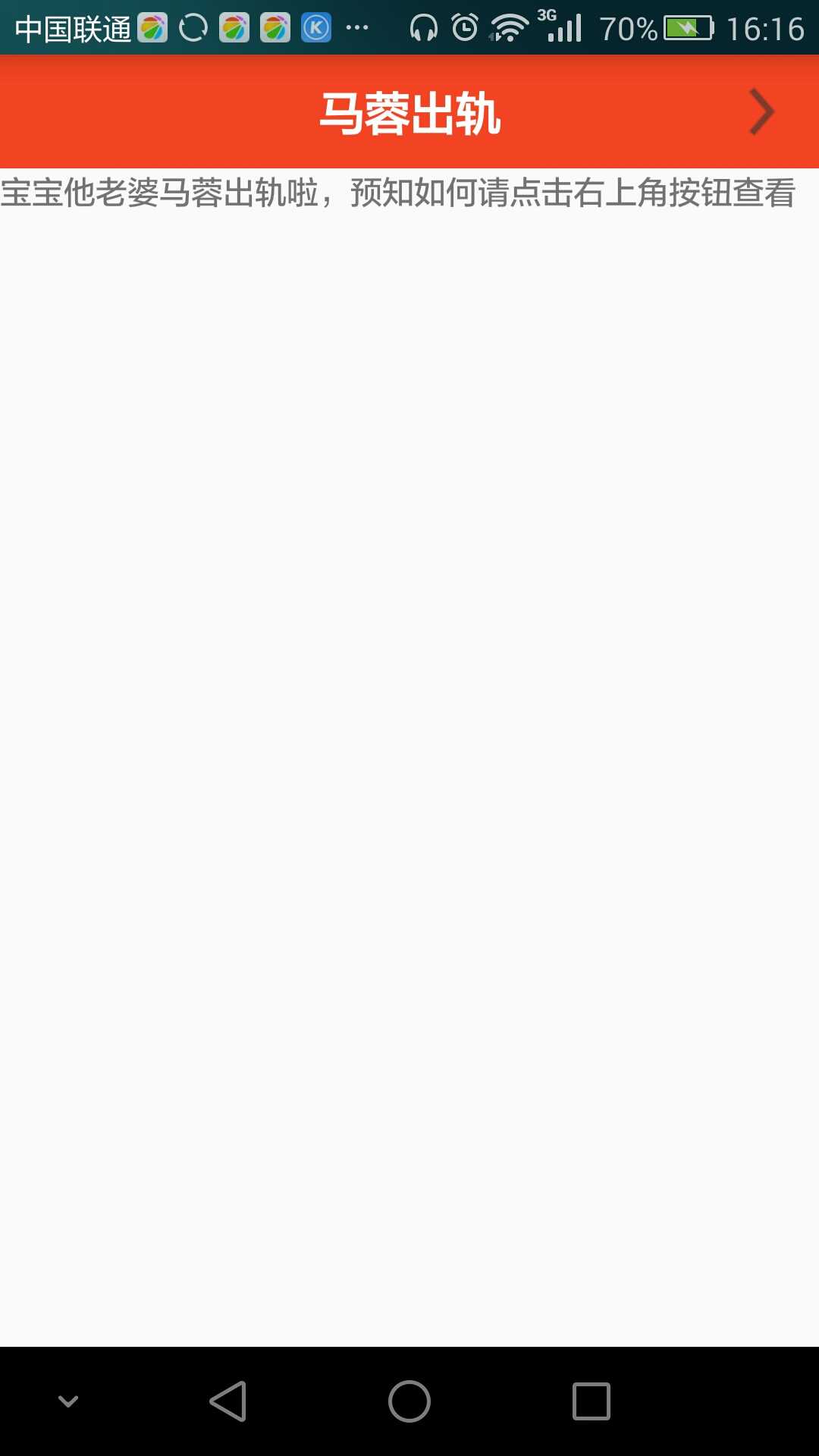 举个最普遍的例子吧,很多App的页面都有标题栏吧,一般都是左边一个返回按钮键,中间一个说明标题文本,几乎每个页面都有标题栏,而且可能除了中间的说明标题文字不一样之外,其他的都一模一样,这时候,总不能每个页面都来这段重复的页面吧,多傻啊,我们只需要新建一个title_bar.xml,在每个页面用<include layout=“@layout/action_bar">把标题栏嵌套进去即可。就说说马蓉出轨这事吧,先看看下面两个页面。