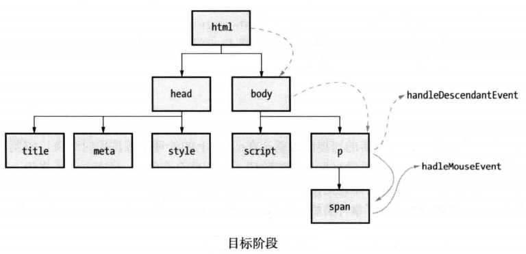 当某个事件被触发时,浏览器会找出事件涉及的元素,它被称为该事件的目标。浏览器会找出body元素和目标之间的所有元素并分别检查它们,看看它们是否带有事件处理器且要求获得其后代元素触发事件的通知。浏览器会先触发这些事件处理器,然后才会轮到目标自身的处理器。