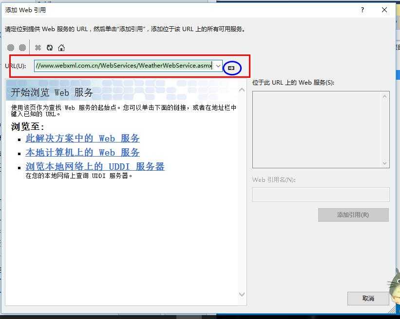 3 、 将Web接口复制到URL右边的框里-->点击输入框右边的箭头,测试连接(观察左下角看是否连接成功)--> 最右边可以更改Web引用名-->添加引用。