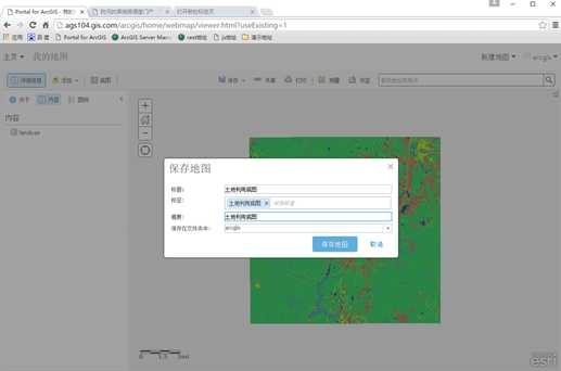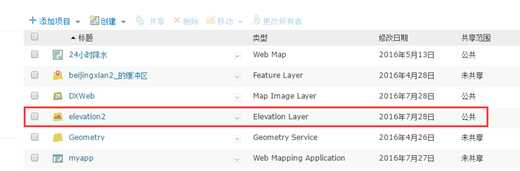 设置好后可以直接共享出去,发布到portal中。在portal中有特别的显示,不是传统的地图服务Map Image Layer ,而是一种新的服务方式Elevation Layer,如下图所示