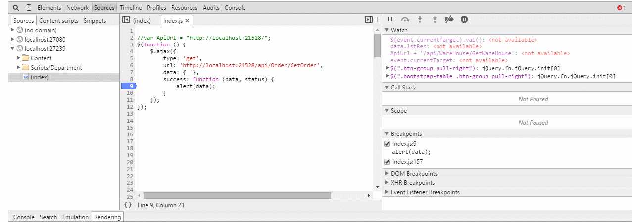 1 $(function () { 2 $.ajax({ 3 type: ‘get‘, 4 url: ‘http://localhost:21528/api/Order/GetOrder‘, 5 data: {}, 6 success: function (data, status) { 7 alert(data); 8 } 9 }); 10 });