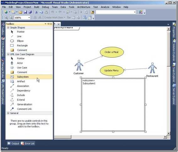 17. 在工具箱中选择子系统图标,并将其拖拽到设计界面中,放置于前一步骤中完成的用例图的下方