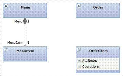 注意,上面描述中使用的词汇就是我们在模型中使用的类名。现在删除概念模型中类与类之间的不准确的关系。例如,图中明确显示了每个订单只关联一个菜单。