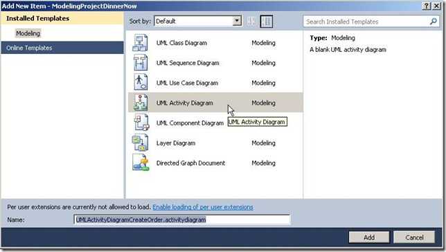 2. 在添加新项对话框中选择UML类图模板,并定义名称为UMLClassDiagramDinnerNow.classdiagram. 效果如上图所示。