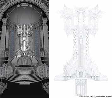 Lucis王谒见Ardyn Izunia(Niblheim帝国的宰相)时的背景模型和实际的分镜的例子