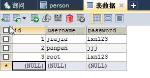 * 在Mysql数据库中创建一个person数据表,添加三个字段,id,user,password,并录入几条记录