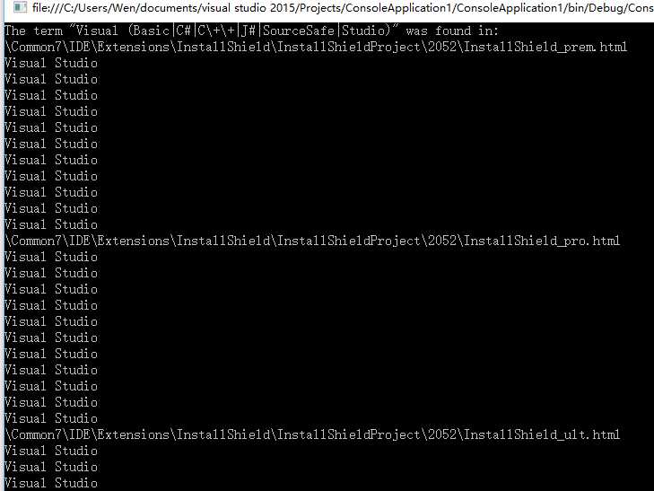 1 //根据不同版本的 vs 修改路径 2 const string floder = @"C:\Program Files (x86)\Microsoft Visual Studio 14.0\"; 3 var infoes = GetFiles(floder); 4 //创建正则表达式来寻找所有的"Visual" 5 var searchTerm = new Regex(@"Visual (Basic|C#|C\+\+|J#|SourceSafe|Studio)"); 6 7 //搜索每一个“.html”文件 8 //通过 where 找到匹配项 9 //【注意】select 中的变量要求显示声明其类型,因为 MatchCollection 不是泛型 IEnumerable 集合 10 var query = from fileInfo in infoes 11 where fileInfo.Extension == ".html" 12 let text = File.ReadAllText(fileInfo.FullName) 13 let matches = searchTerm.Matches(text) 14 where matches.Count > 0 15 select new 16 { 17 name = fileInfo.FullName, 18 matchValue = from Match match in matches select match.Value 19 }; 20 21 Console.WriteLine($"The term \"{searchTerm}\" was found in:"); 22 23 foreach (var q in query) 24 { 25 //修剪匹配找到的文件中的路径 26 Console.WriteLine($"{q.name.Substring(floder.Length - 1)}"); 27 28 //输出找到的匹配值 29 foreach (var v in q.matchValue) 30 { 31 Console.WriteLine(v); 32 } 33 }