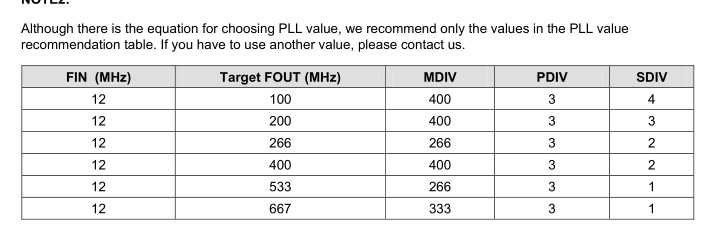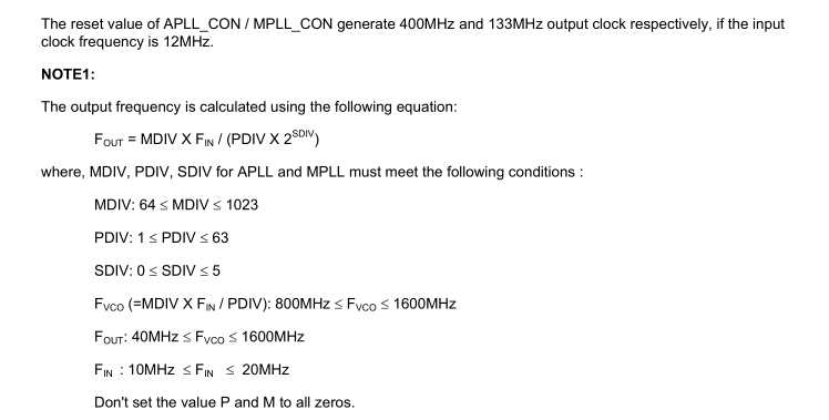 由于在第三步设置中将APLL和MPLL的输出(Fout)都设置成了533MHZ 由上图Fout的公式和TargetFout的参考表可MDIV=226,PDIV=3,SDIV=2