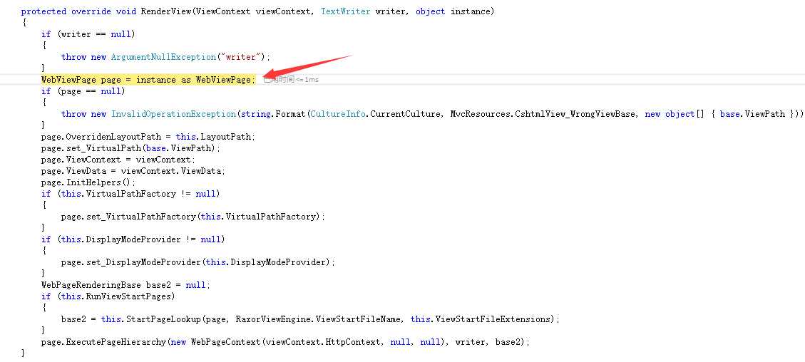 在RenderView方法里面把我们的indexcshtml类转成了WebViewPage,也就是它的父类,然后又开始填充ViewData,ViewContext等。下面有一个Inithelpers看的出来也就是初始化我们的@html,@ajax等。下面释放内存转到页面。