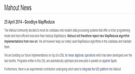 不过 hadoop 3.0 号称比 spark 快10呗。 不知道 Mahout 会不会跟 MR say Hi ! 互联网变化这么快,谁知道呢?