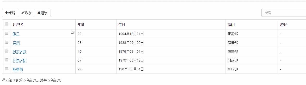 public JsonResult GetUsers() { var lstRes = new List<User>(); lstRes.Add(new User() { Id = "1", UserName = "张三", Age = 22, Birthday = Convert.ToDateTime("1994-12-21"), DeptId = "1", DeptName = "研发部" }); lstRes.Add(new User() { Id = "2", UserName = "李四", Age = 28, Birthday = Convert.ToDateTime("1988-09-09"), DeptId = "2", DeptName = "销售部" }); lstRes.Add(new User() { Id = "3", UserName = "风衣大叔", Age = 40, Birthday = Convert.ToDateTime("1976-09-01"), DeptId = "2", DeptName = "销售部" }); lstRes.Add(new User() { Id = "4", UserName = "闪电大虾", Age = 37, Birthday = Convert.ToDateTime("1979-03-12"), DeptId = "4", DeptName = "创意部" }); lstRes.Add(new User() { Id = "5", UserName = "韩梅梅", Age = 29, Birthday = Convert.ToDateTime("1987-05-01"), DeptId = "5", DeptName = "事业部" }); return Json(lstRes, JsonRequestBehavior.AllowGet); } public JsonResult Edit(User user) { //反序列化之后更新 return Json(new { }, JsonRequestBehavior.AllowGet); }