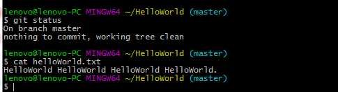 使用commit命令之后在查看版本库当前状态,就可以看到,此时并没有需要被提交到版本库中的文件,使用cat命令查看一下当前文件的内容。