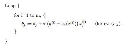 因此梯度下降法又衍生出一下其他形式,随机梯度下降法就是其中之一。顾名思义,所谓随机就是随便选取一个或一组数据去代替整个数据集来更新参数,这样计算量就会大大减少。很多文章中的随机梯度下降都只随机选取一个数据作为参考,因此有时也称为online-GD,当随机选取一组数据时又称mini-batch GD,其实本质上应该都是SGD(我是这么理解的。。),其参数更新如下。