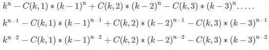 小L决定用K种珍珠为妹子做一串举世无双的珍珠垂饰。珍珠垂饰是由珍珠连接而成的,其长度可以认为就是珍珠垂饰上珍珠的个数。小L现在腰缠万贯,每种珍珠他都拥有N颗。根据将珍珠垂饰打开后珍珠不同的排列顺序可以区别不同种类的项链。现在,小L好奇自己可以组成多少种长度为1至N的不同的珍珠垂饰?当然,为显富有,每串珍珠垂饰都要必须由K种珍珠连成。 答案取模1234567891。