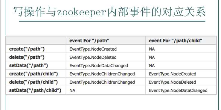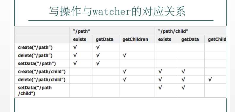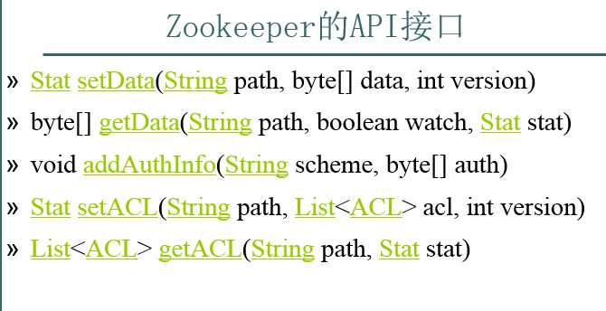 - 创建一个给定的目录节点 path, 并给它设置数据;判断某个 path 是否存在,并设置是否监控这个目录节点,这里的 watcher 是在创建 ZooKeeper 实例时指定的 watcher,exists方法还有一个重载方法,可以指定特定的 watcher ;重载方法,这里给某个目录节点设置特定的 watcher;删除 path 对应的目录节点,version 为 -1 可以匹配任何版本,也就删除了这个目录节点所有数据 ;获取指定 path 下的所有子目录节点,同样 getChildren方法也有一个重载方法可以设置特定的 watcher 监控子节点的状态