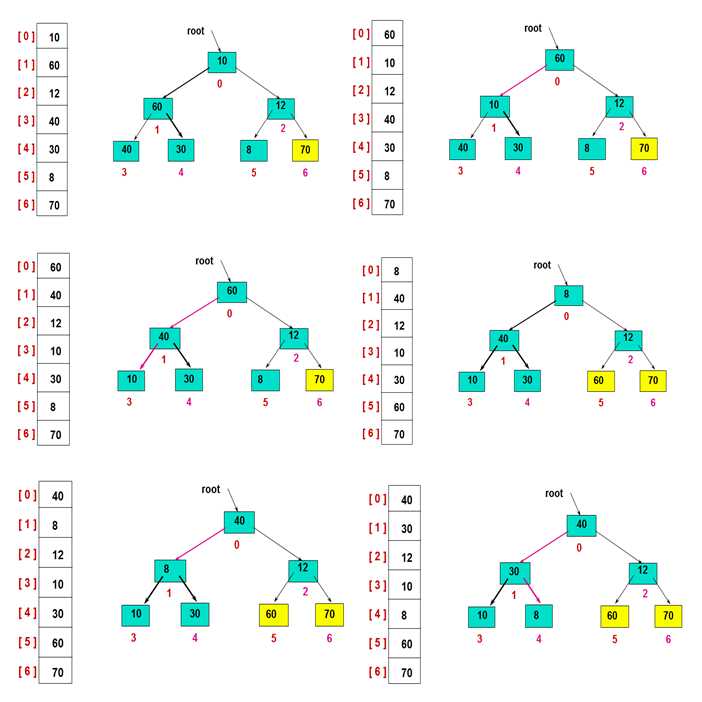 然后,交换堆顶的元素和最后一个元素,此时最后一个位置作为有序区(有序区显示为黄色),然后进行其他无序区的堆调整,重新得到大顶堆后,交换堆顶和倒数第二个元素的位置……